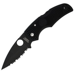 Spyderco Features a 3.13 in. CPMS30V black serrated blade and a 3.94 in. black FRN handle in a textured bi-directional pattern designed to prevent slipping forward or backward in the hand. It carries tip up with a black ambidextrous clip.